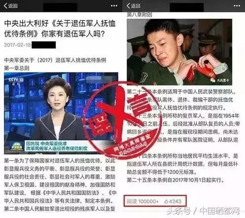 近日,很多人的朋友圈都频繁出现一篇题为“中央出大利好《关于退伍军人抚恤优待条例》,你家有退伍军人吗”的网文,文首配送一张中央电视台《新闻联播》的画面截图,图上显示“国务院—中央军委批准改革完善军人退役养老保险制度”字样。