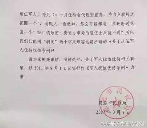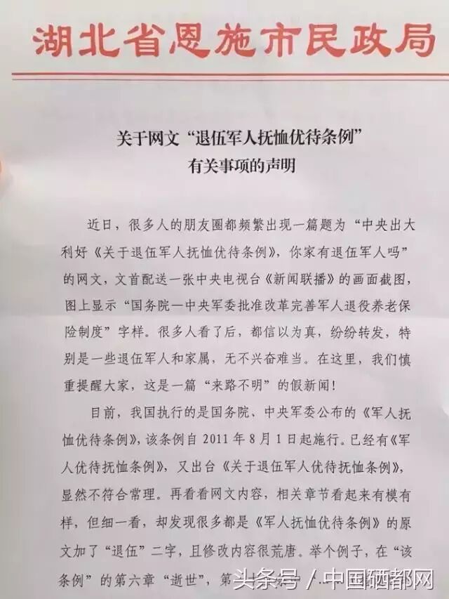 很多人看了后,都信以为真,纷纷转发。特别是一些退伍军人和家属,无不兴奋难当。在这里,恩施市民政局慎重提醒大家: