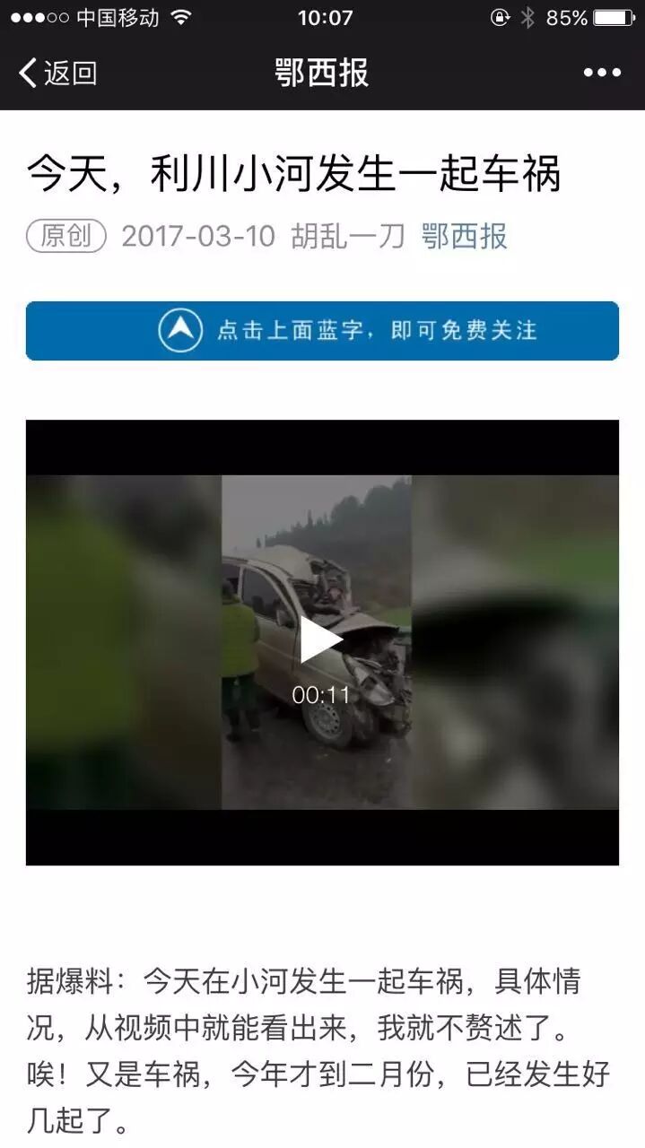 3月10日,一个名为“鄂西报”的微信公众号,发布了一篇《今天,利川小河发生一起车祸》文章。